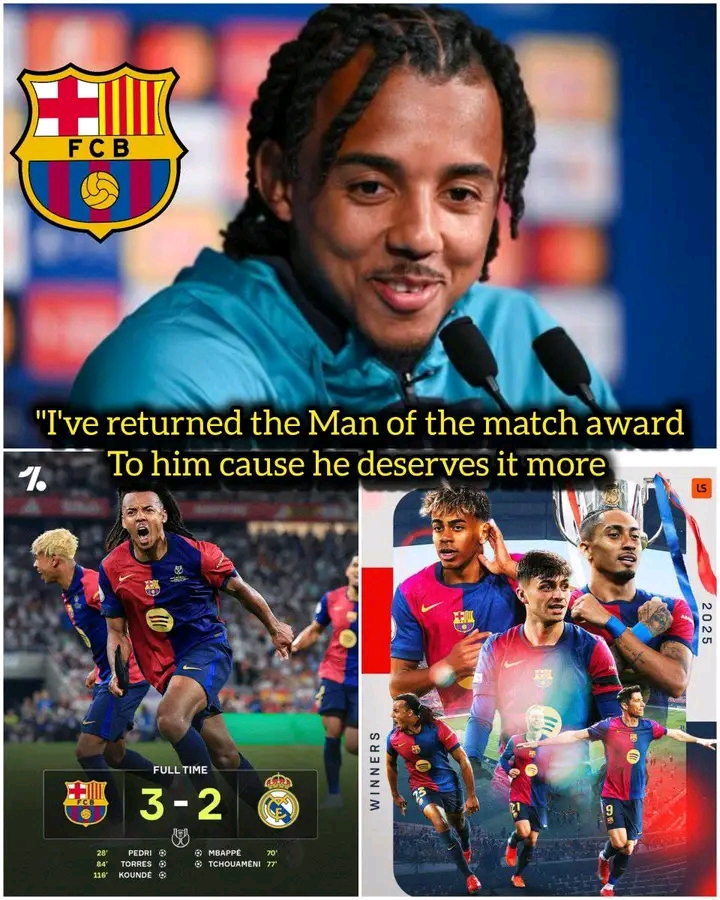 In a heartwarming display of humility and team spirit, Barcelona’s Jules Koundé has chosen to return his Man of the Match award to a teammate who, in his words, “played out his heart for us to get this winning today.” This gesture followed Barcelona’s thrilling 3-2 extra-time victory over Real Madrid in the Copa del Rey final, held at Estadio La Cartuja in Seville. Koundé, who scored the decisive goal in the 116th minute, acknowledged that while he may have netted the winner, it was another player’s exceptional performance that truly turned the tide for Barcelona. The match saw Barcelona take an early lead through Pedri, only for Real Madrid to respond with goals from Kylian Mbappé and Aurélien Tchouaméni. Ferran Torres then equalized late in the game, pushing it into extra time, where Koundé capitalized on a Madrid error to seal the victory. While Koundé’s goal was pivotal, his decision to hand over the Man of the Match award highlights the collective effort and standout performances from his teammates. Notably, goalkeeper Wojciech Szczęsny delivered a remarkable performance, making crucial saves that kept Barcelona in the game during critical moments. His efforts were instrumental in ensuring the team remained competitive, especially during Real Madrid’s aggressive second-half surge. Koundé’s gesture underscores the ethos of unity and mutual respect within the Barcelona squad. It’s a testament to the team’s culture, where individual accolades are secondary to collective success. Such actions not only boost team morale but also set a precedent for sportsmanship and camaraderie in professional football. This victory marks Barcelona’s 32nd Copa del Rey title, adding to their illustrious history. With the team displaying such cohesion and determination, they remain strong contenders for a potential treble this season. As they continue their campaign, the spirit exemplified by Koundé’s selfless act will undoubtedly serve as a cornerstone for their pursuit of further glory.